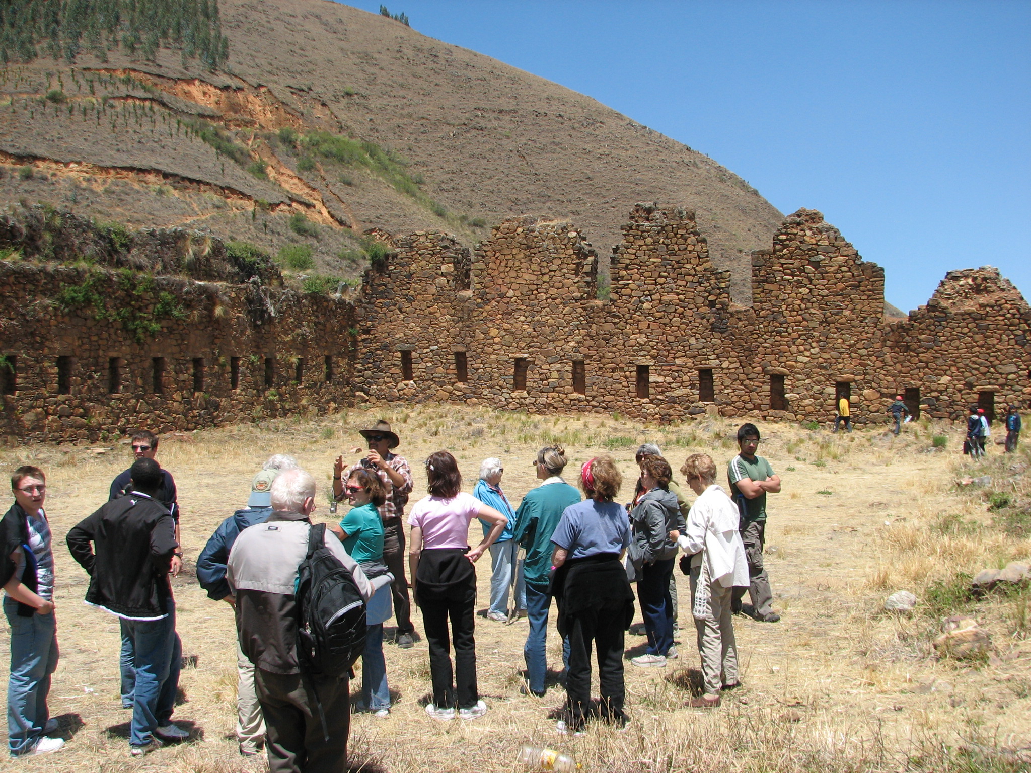 Our big excursion was to Incajacta where the second largest building in the Incan empire is located. The building was 90 meters by 27 meters (290' by 88') and was covered with a roof. The weather was the best I remember with a huge blue sky and a few clouds just to break up the monotony. I have taken many panoramas of the valley over the years that can be compared with this year's image. Some of you may find it interesting to see the changes over time. I found several new vantage points from which to take panoramas. This year the waterfall was in half shade, half bright sun, an impossible number of f-stops to photograph. I have included two multiframe vertical images of the falls taken in 2009. The group at the base is the semester abroad group from that year. I do not remember being told that the red color (last picture, first row below) is the original 600 year old stucco. Will ours be around in 2525?